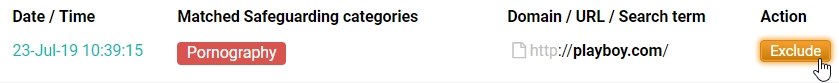- The exclusion for this Domain, URL or Search term will then appear on the Reports > Safeguarding > Exclusions page alongside the Type and Safeguarding theme.